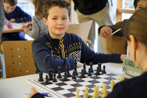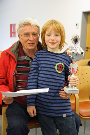 (ew) Jedes Jahr in der Woche vor Ostern spielt die Hessische Schachjugend die Hessische Jugend-Einzelmeisterschaften der Altersklassen U10 bis U18 in der Jugendherberge Bad Homburg aus. Mit allein sechs Teilnehmern in der U10 war die VSG-1880-Offenbach wie schon im Dezember bei der U8-Meisterschaft einer der teilnehmerstärksten Vereine. Unter den mehr als 70 teilnehmenden Jungen und Mädchen dieser Altersklasse ragte erneut Dominik Laux von der VSG heraus. Als amtierender Hessenmeister der U8 trat er nur drei Monate nach dem Titelgewinn auch eine Altersklasse höher an. Nach drei vergleichsweise schnellen Auftaktsiegen wurde in der vierten Runde der an Nummer Eins gesetzte Topfavorit und letztjähriger WM-Teilnehmer Markus Kirchner von den Schachfreunden Schöneck als Gegner zugelost. Dominik Laux gelang die Überraschung und konnte die Partie nach gut zwei Stunden für sich entscheiden. Beflügelt durch diesen Erfolg gelang ihm eine Runde später ein Remis gegen den an Nummer Zwei gesetzten Richard Bethke vom Schachclub Gelnhausen, der ebenfalls schon an einer Weltmeisterschaft teilgenommen hatte. Dominik und Richard marschierten daraufhin im Gleichschritt durch das Turnier. Nach jeweils einem abschließenden Remis in der letzten Runde war klar, dass beide punktgleich die Plätze eins und zwei belegen sollten. Die Buchholzwertung, so etwas wie das Torverhältnis des Schachspiels, musste daher über die Hessenmeisterschaft entscheiden. Dominik Laux fehlte in dieser Wertung am Ende nur ein Pünktchen zum Titel. Über die vorher nicht erwartete Vizemeisterschaft freute er sich aber riesig. Neben einem großen Pokal wird sie nämlich zusätzlich mit der Teilnahme an der Deutschen Vereinsmeisterschaft Ende Mai in Willingen belohnt. Vom Erfolg beflügelt spielte Dominik auch noch die anschließende U12 mit und wurde als hervorragender 8. unter 65 Teilnehmern bester Offenbacher Spieler.