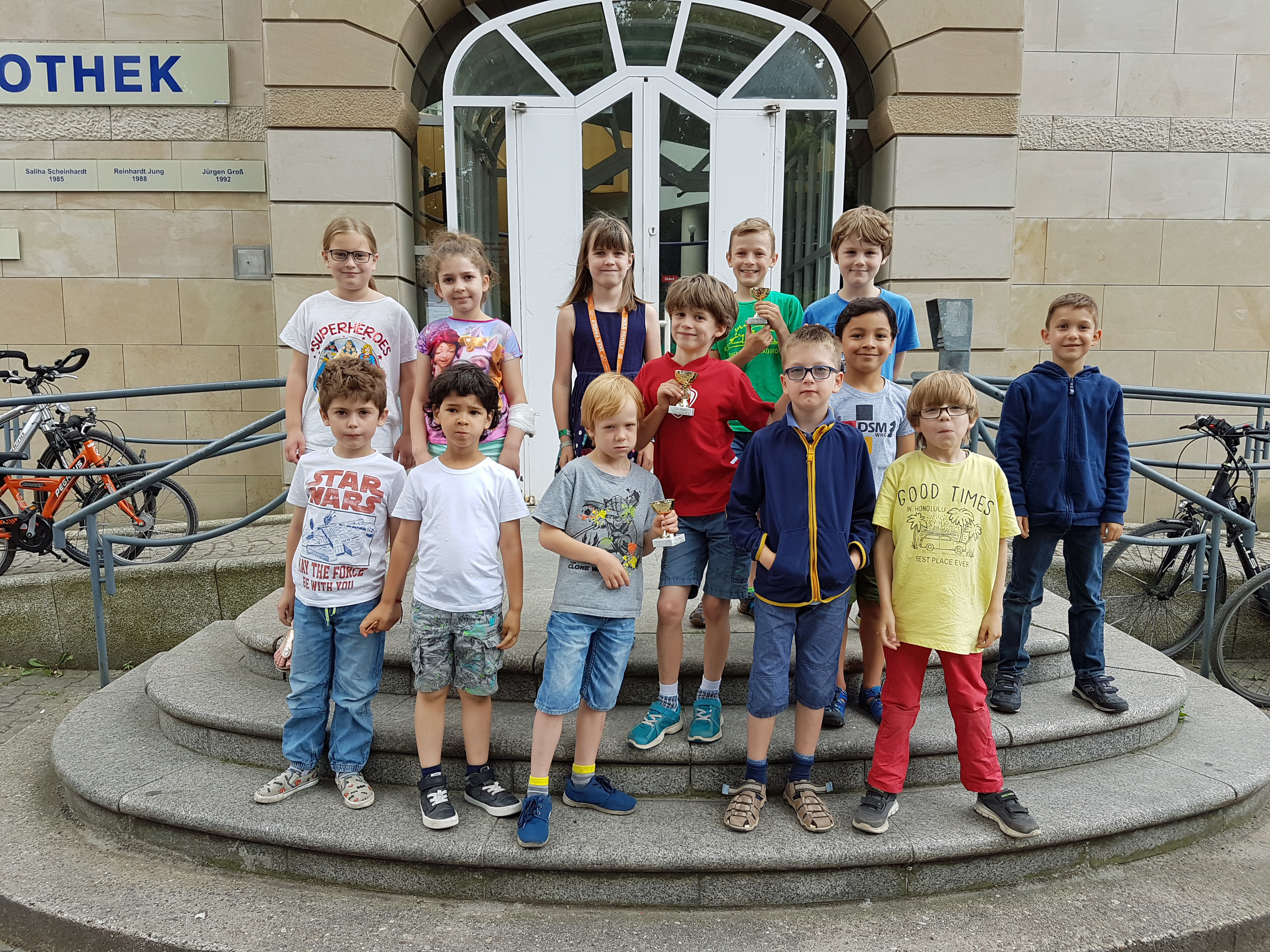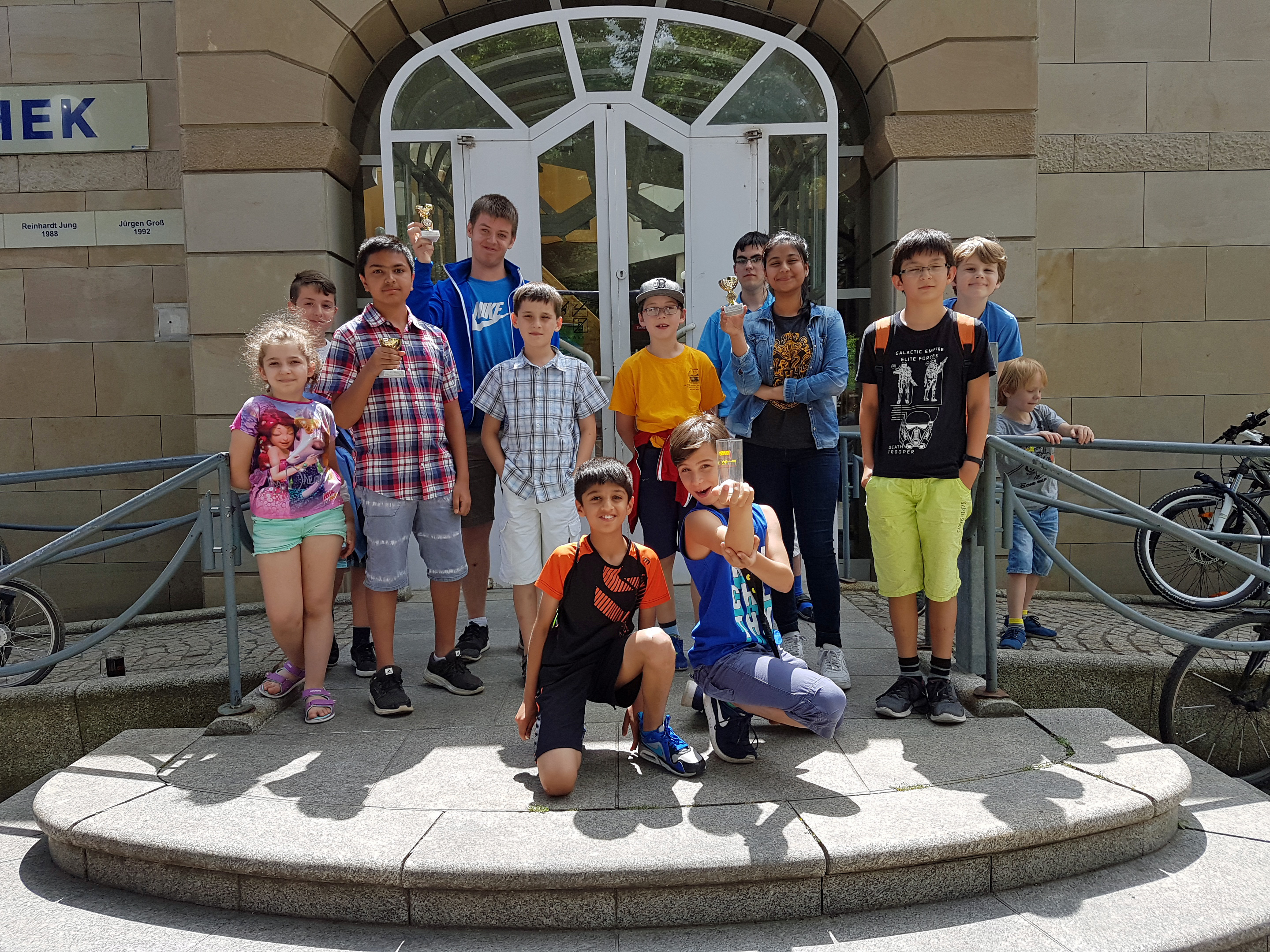 Höhepunkt für die Jugend waren am Sonntagmittag die beiden Blitzschachturniere für Grundschüler und weiterführende Schulen. Nicht dabei sein konnten zwar die Vereinsspieler der parallel stattfindenden U12-Mannschaftsmeisterschaft in Darmstadt, aber das erhöhte die Chancen der nicht Vereinsspieler. Unter dem Motto „Ein ganzes Turnier in nur einer Stunde“ wurden die fünf Runden durchgespielt. Bei den Grundschülern setzte sich Lennart vor Florin und Vorjahressieger Filip durch. Beim anschließenden Turnier der älteren Schüler gewann Kolja souverän vor Win und Naina. Die jeweils ersten drei erhielten Mainuferpokale als Preise. Gummibärchen für alle Teilnehmer rundeten die Siegerehrung ab. Danach wurde der Spielstand wieder für alle Besucher geöffnet.