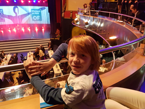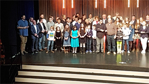 Eingebettet in einen bunten Reigen aus Tanz- und Showaufführungen wurden über den Abend verteilt die Auszeichnungen in Bronze, Silber und Gold an die Sportler vergeben. Bronze-Auszeichnungen gingen dieses Jahr bei der VSGO an Dominik Laux für den Gewinn der U12 Hessenmeisterschaft, den Gewinn der Hessischen U10-Mannschaftsmeisterschaft an Dominik Laux, Rosalie Werner, Josi Hentschker und Laura Dixon und den Gewinn der Hessischen U12-Mädchenmannschaftsmeisterschaft an Rosalie Werner, Laura Dixon, Josi Hentschker und Melissa Bayer. Melissa war unsere Gastspielerin vom SK-Gründau. Höhepunkt der Ehrung war sicherlich, dass Dominik stellvertretend für alle mit der bronzenen Auszeichnung geehrten Sportler auf offener Bühne interviewt wurde. Schlagfertig konnte er alle Fragen unterhaltsam beantworten.