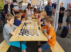 Nach der fast schon traditionellen Standeröffnung am Samstag Nachmittag durch Bürgermeister Peter Schneider im Rahmen einer Schnellschachpartie folgte das im Vorjahr erstmals ausgetragene Blitzturnier der Grundschüler über 6 Runden um den „Mainufercup“. 12 mutige Kinder zwischen 6 und 10 Jahren aus mehreren Grundschulen hatten sich gemeldet und nahmen die Herausforderung an. Das Turnier bot Hochspannung pur. Vermeidliche Außenseiter gewannen gegen gefühlte Favoriten und umgekehrt. Nach den sechs Runden hatte nur ein Spieler noch eine weiße Weste. Verdienter Gewinner wurde damit Filip, VSG-Spieler und einer der jüngsten Teilnehmer, knapp vor Malik und Merlin. Alle Teilnehmer freuten sich anschließend über Gummibärchen sowie Pokale für die ersten drei. Danach wurde noch locker bis in den Sonnenuntergang von vielen Kindern wie Erwachsenen weitergespielt.