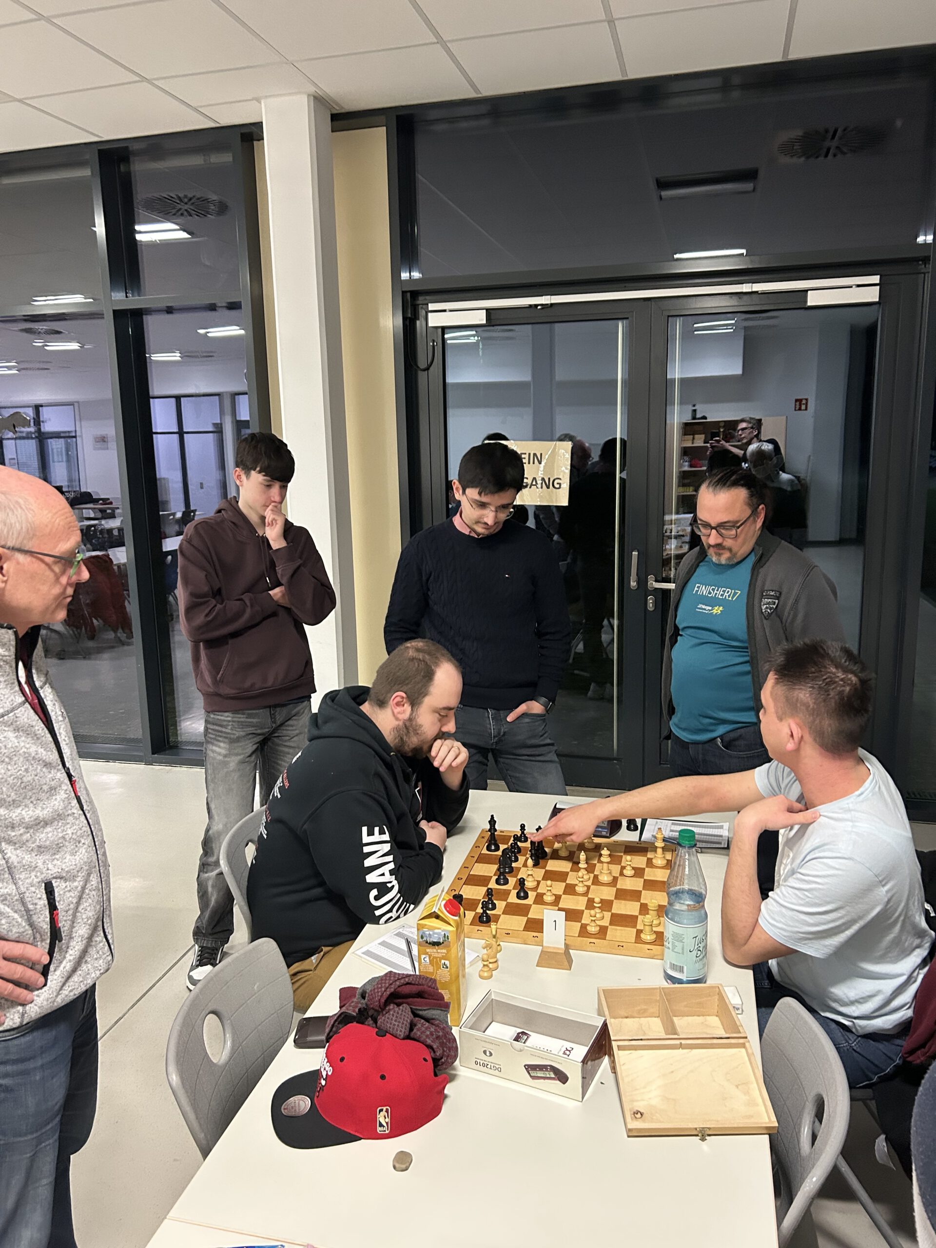 Brett zwei von Gründau fehlte krankheitsbedingt, so dass Offenbach mit 1:0 in Führung ging. Der Topscorer der Mannschaft der Vorsaison, Carsten, erwischte einen durchwachsenen Start und musste sich nach einem Patzer geschlagen geben, 1:1. Doch nur wenig später stellte Mert mit 2:1 wieder die Führung her. Spannend ging es am ersten Brett zu – siehe Titelbild. Doch das Happy End lag auf Gründauer Seite. Jan musste sich zum 2:2 geschlagen geben. Dennis zeigte dann Vertrauen in Elmars Stellung und remisierte zum 2,5:2,5. Jetzt lag der Ausgang der Partie vollständig in Elmars Händen, der zu diesem Zeitpunkt bereits eine Mehrfigur und einen Mehrbauern aufwies. Auch wenn es noch etwas dauern sollte, diesen Vorteil ließ er sich nicht mehr nehmen und vollendete zum 3,5:2,5 Gewinn der Paarung. Auf Platz 6 wurde nun der Anschluss zum punktgleichen vierten Platz hergestellt. Auf die Abstiegsränge wurde das Punktepolster auf fünf Punkte ausgebaut. In den verbliebenen Partien sollte der Klassenerhalt nun hoffentlich zeitnah sichergestellt werden können.