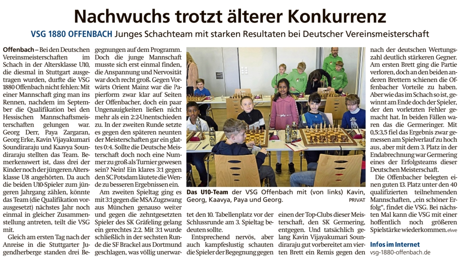 Auf S. 28 berichtet die Offenbach Post über das gute Abschneiden der U10-Mannschaft bei den Deutschen Vereinsmeisterschaften in Stuttgart im vergangenen Dezember.