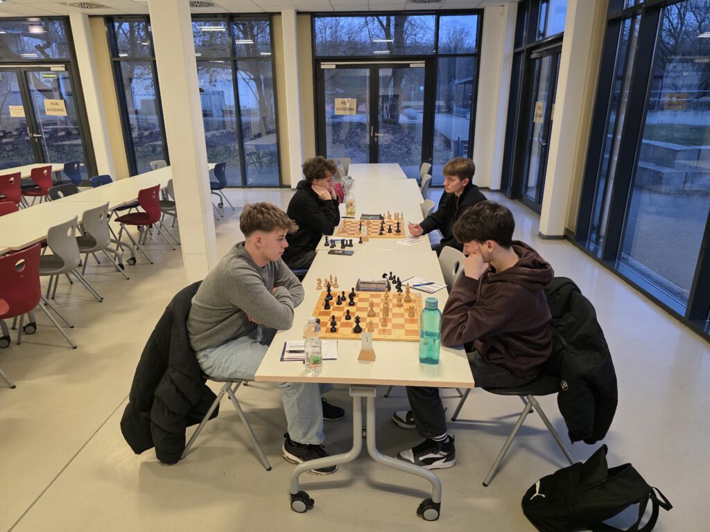In der Offenbacher Leibnizschule wurden die beiden anderen Partien parallel ausgetragen. In der Partie VSGO 2 gegen Frankfurt Nord 1 waren die Frankfurter an drei Brettern leicht favorisiert nach DWZ, an einem Brett die Offenbacher. Otto, Kavin, Elias und Kaavya – siehe Titelbild vom Saisonauftakt – wollten aber gut gegenhalten und ihre Chancen nutzen. Leider sollte das an diesem Spieltag nur bedingt gelingen. Kaavya, Elias und Kavin mussten sich geschlagen geben. Otto gelang am ersten Brett aber der Achtungserfolg zum 1:3 gegen den DWZ-stärksten Spieler der Begegnung. Darauf lässt sich doch aufbauen.