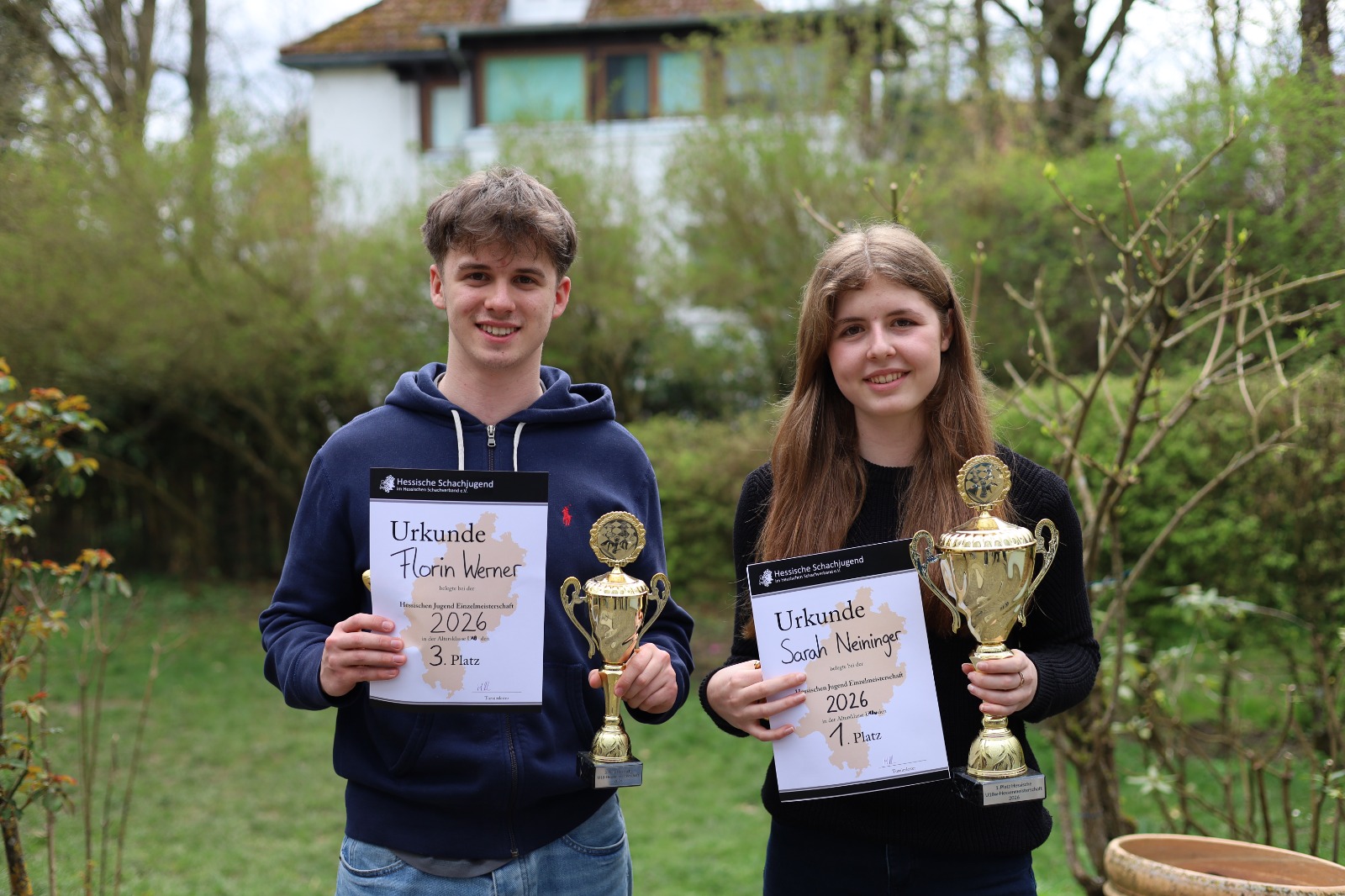 Um die Plätze ganz vorne kämpften Sarah (U18w) und positiv überraschend Florin (U18). Sarah gelang dabei ein souveräner Start-Ziel-Sieg mit sechs von sieben möglichen Punkten. Ohne Niederlage gab sie lediglich bei zwei Remisen halbe Punkte ab und sicherte sich den großen Pokal sowie den Startplatz bei der Deutschen U16w-Meisterschaft in Willingen in der Pfingstwoche! Wir gratulieren herzlich! Florin ging von Startplatz acht ins Rennen, favorisiert waren aber ganz andere Spieler mit Wertungen von bis zu mehr als 2200 DWZ-Punkten. Doch Florin gelangen Erfolge gegen deutlich stärker gewertete Spieler. Und so stand er nach sechs Runden mit fünf Punkten überraschend, aber verdient, auf dem zweiten Rang. In der letzten Runde wollte er die Chancen auf den Titel noch nutzen und riskierte in diesem Spiel alles, zumal der Führende seine Partie verloren geben musste. Doch auch Florin musste sich geschlagen geben, was Platz drei und einen schönen Pokal in der Endabrechnung bedeutete! Auch hier herzliche Glückwünsche!