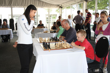(EW) In welcher Sportart kann man schon in jungen Jahren gegen Nationalspieler antreten? Was im Fußball kaum klappen dürfte, ist im Schach möglich. Am Samstag, den 8.9.2012, organisierten die Schachfreunde von 1891 Friedberg anlässlich des Frankfurter Familiensportfestes auf der Galopprennbahn in Niederrad ein Simultanschachspiel an 20 Brettern gegen Mai Linh Tran. Die 17-jährige ist Juniorennationalspielerin und tritt für die Schachfreunde Friedberg in der 1. Bundesliga an. Tom aus der U10 der VSG 1880 Offenbach war so mutig, und nahm an der Veranstaltung teil. Trotz eines frühen Patzers in der Königsgambit-Eröffnung hielt er bei hochsommerlichen Temperaturen fast 4 Stunden durch. Ein zwischenzeitlich schüchtern vorgetragenes „Remis?“ wurde zwar höflich abgelehnt: „Ach, spielen wir noch etwas“. Aber es dauerte dann doch 38 Züge, bis Mai Linh Tran sich mit einem souveränen „Schach matt“ durchsetzen konnte. Für Tom blieb die Erkenntis, dass Nationalspielerinnen richtig nett sein können und dass er sich nun auch mal an die älteren Jungs im Dientagstraining trauen kann.