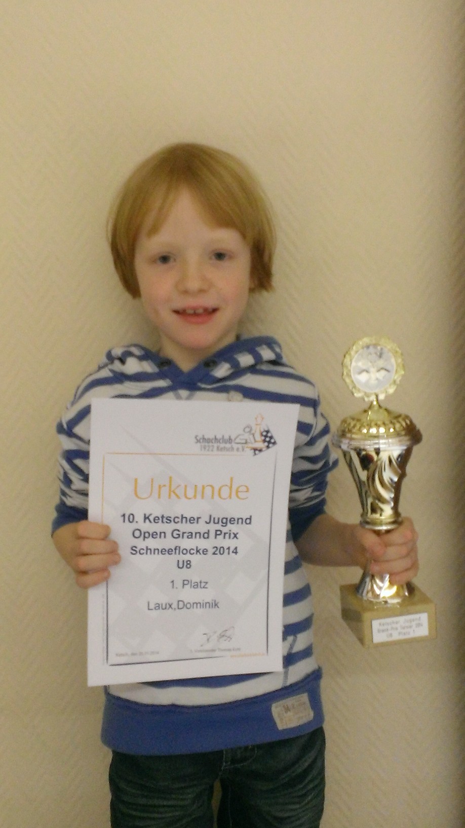 (EW) Das Jahr 2014 fängt gut an! Gleich beim ersten Jugendturnier des Jahres, dem 10. Schneeflocke Jugend Grand Prix des Schachclubs Ketsch in Baden Würtemberg, spielte Dominik ein herausragendes Turnier und gewann am Ende mit 6,5 aus 7 völlig verdient den Siegerpokal. Dominik war der einzige Vertreter der VSG in Ketsch, aber das wird sich nächstes Jahr bestimmt ändern, war es doch nicht nur ein erfolgreiches sondern auch ein von den Veranstaltern sehr schön organisiertes Turnier.