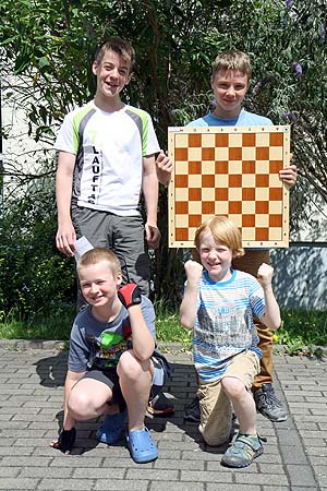 (ew) Kolja Hegmann, Dominik Laux, Tim Sommer und Tom Werner freuten sich am neunten und letzten Spieltag in der U12-Schülerliga des Schachbezirkes Main-Vogelsberg nicht nur über ein klares 3:1 gegen Dietzenbach, sondern krönten damit auch eine ganze Ligasaison ohne eine einzige Niederlage der Mannschaft. Zu diesem tollen Ergebnis haben im Saisonverlauf auch Benedikt Westhof und Gero Hofmann mit wichtigen Punkten beigetragen (beide nicht auf dem Foto). Dominik Laux, dieses Jahr noch in der U8 spielberechtigt und jüngstes Mannschaftsmitglied, holte darüber hinaus über die Saison herausragende 8,5 von 9 möglichen Punkten und wurde damit „Top-Scorer“ unter den 75 in zehn Mannschaften spielenden Kindern der Liga. Auch wenn dies nach einer klaren Meisterschaft klingt, betrug der Abstand auf den zweitplatzierten SK Gründau am Ende nur einen halben Brettpunkt.